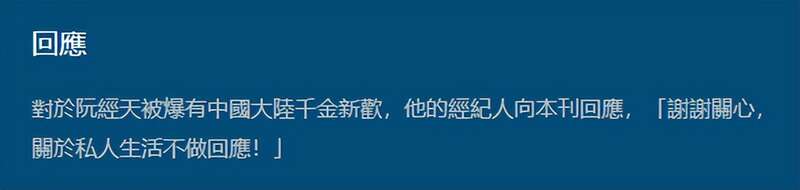 台媒也第一时间采访阮经天经纪人,她没有否认,仅回应“谢谢关心,关于私人生活不做回应”。