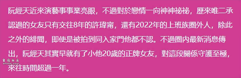 据台媒爆料,42岁的阮经天低调和小20岁的富二代千金小姐交往,女方有混血长相,年轻漂亮身材好,目前正在韩国国际学校读书,也就是说,女方还是大学生一名。
