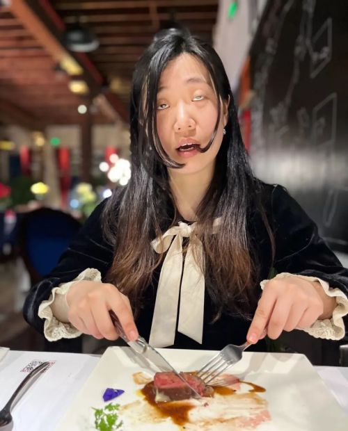 还有餐厅这张,别人情侣约会是烛光晚餐,这位男友拍出来的效果却像女朋友被恶灵附身,翻白眼、面部扭曲,下一秒感觉就要扑上来咬人。