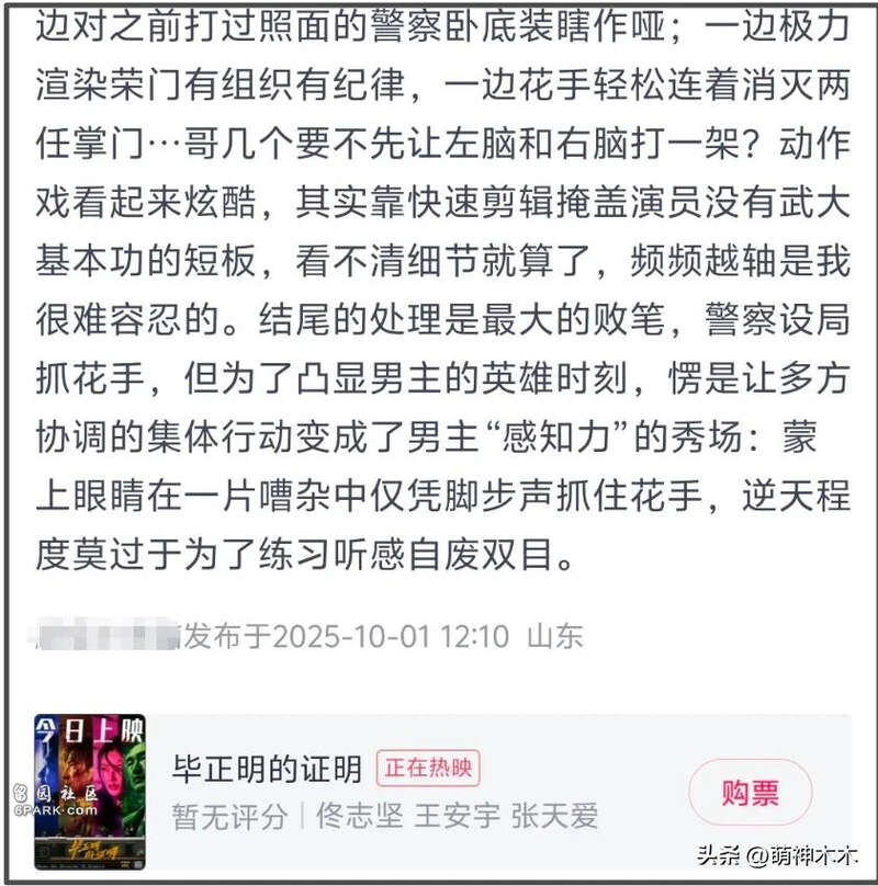 王安宇饰演的男主毕正明都放在电影标题了,他演了一个意外致残的警察,为了证明自己闯入了盗贼团伙,故事主题是反扒,但众所周知,一部凸显主角还带有个人英雄主义色彩的片子,演员最好还是有点票房号召力,不然很容易自娱自乐。