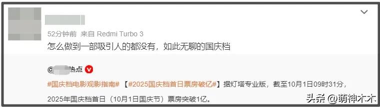 ——无大爆、无逆转、无惊喜,甚至连两极分化都没有,还真是应了网友的话,2025年国庆档电影好无聊!