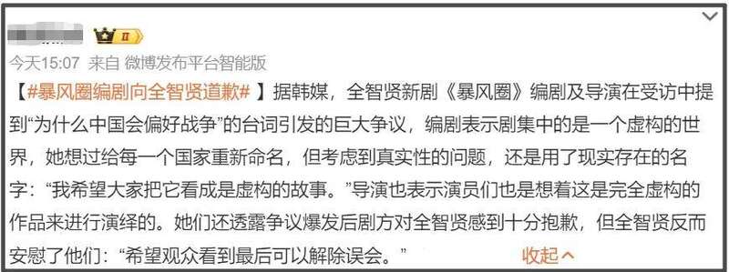 更令人无语的是,包括全智贤本人在内,《暴风圈》全体主创没有对中国以及被抹黑的所有国家表现出哪怕任何一点歉意,反而互相安慰了起来,编剧和导演在那心疼全智贤被骂,全智贤还安慰编剧和导演都是误会。