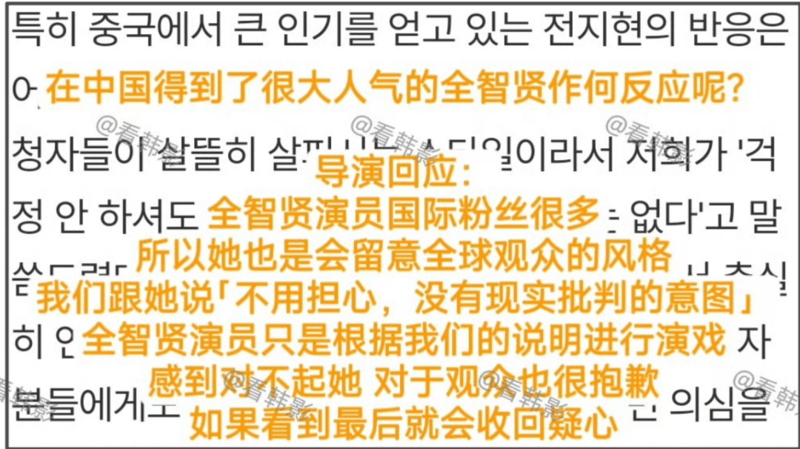 10月2日,编剧郑瑞景与导演金熙元接受韩媒采访,回应剧中争议台词。两人口径一致,连连向主演全智贤道歉,称“争议影响其商业代言”,却对真正被冒犯的中国观众轻描淡写。更绝的是,他们搬出“虚构世界”来挡枪——声称剧中国家“虽用真实名称,但均为虚构”,甚至透露原计划给各国改名,但为了“增强沉浸感”才保留现实国名。