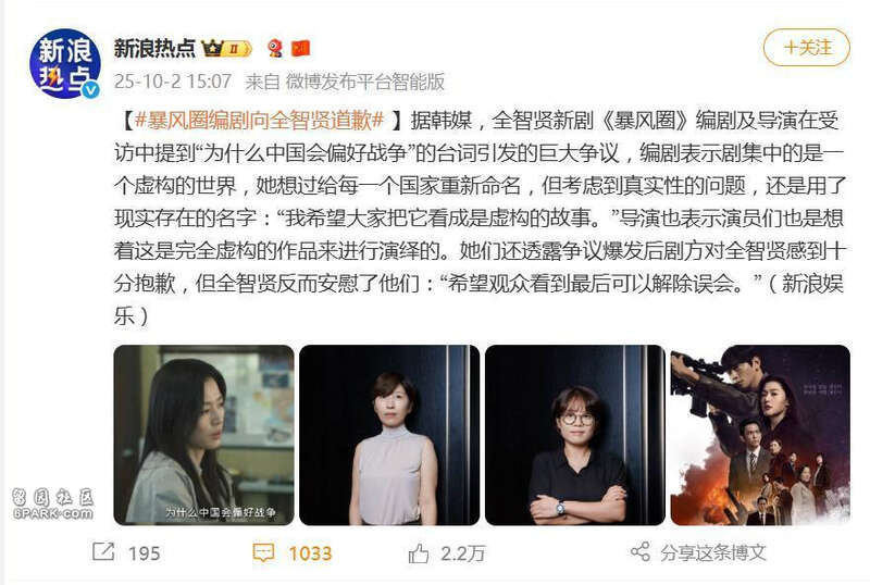 韩剧《暴风圈》一句“为什么中国会偏好战争”的台词,最近在网络上上捅了马蜂窝。10月2日,编剧和导演紧急出面灭火,可这波“架空世界”的解释,非但没平息众怒,反而被网友怼上了热搜。