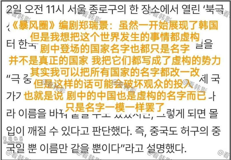 谁不知道《暴风圈》背景是虚构的?需要认清现实的明明是你们韩国人吧。