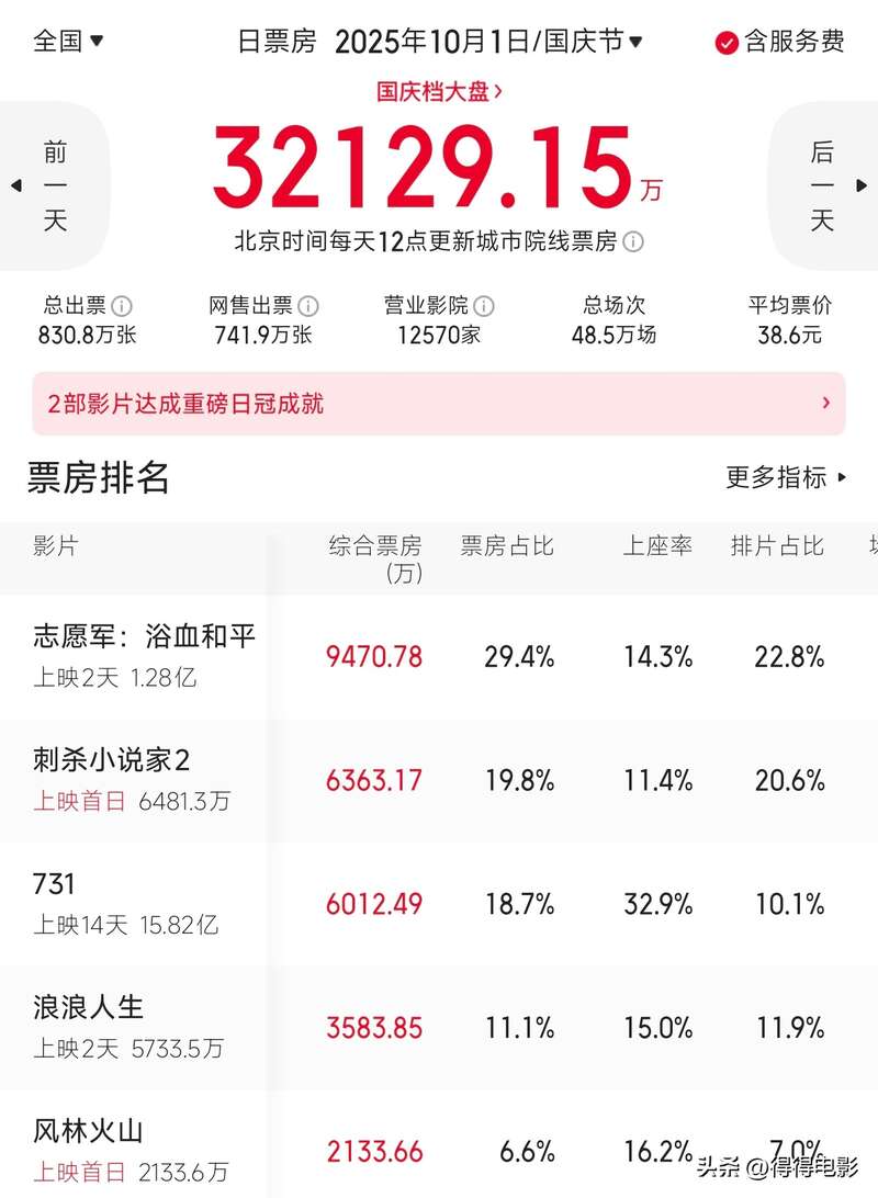 《刺2》首映日虽然排在第二位,但也只有6363万票房,被第一名的《志愿军3》断层领先。