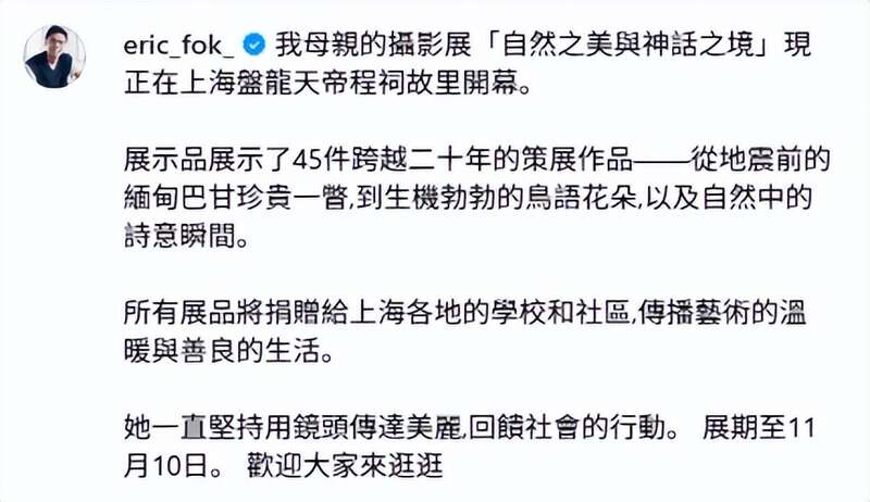 霍启山发文表示,母亲朱玲玲近期在上海举办摄影展,是她跨越20年拍摄的作品,展会的全部收入都捐给上海各地的学校和社区,欢迎大家来参展。