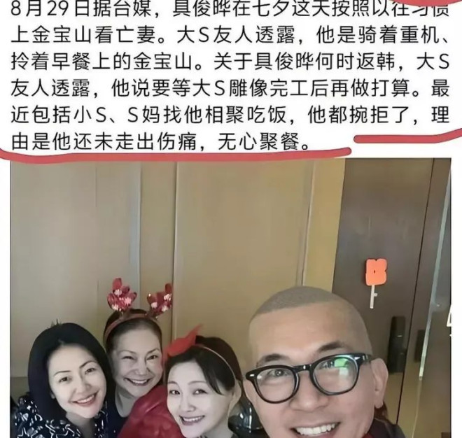 那段时间,具俊晔的 “深情戏” 演得十足:他总以 “纪念妻子” 为由去墓地,一坐就是一整天,带咖啡面包看大 S 的旧作,拿花草清理墓碑积灰;台媒还拍到他带朋友去探望,哪怕没发动态,“偶遇” 他的网友也总能把画面传到网上。