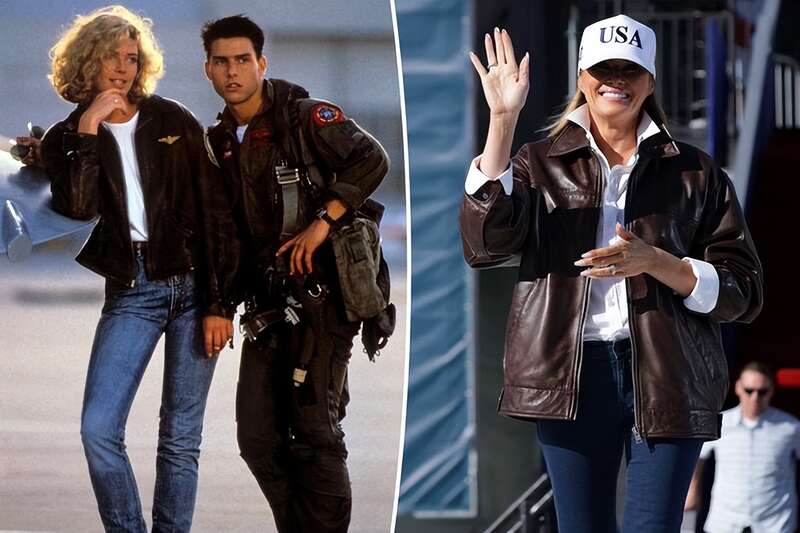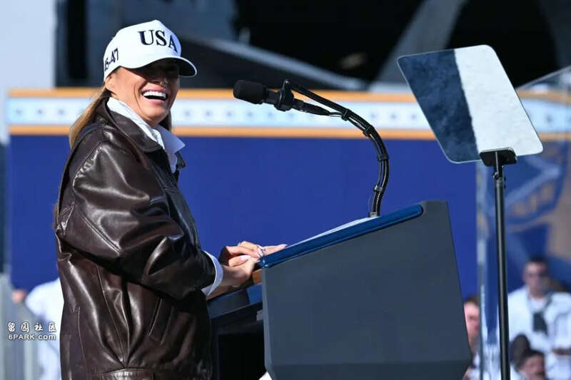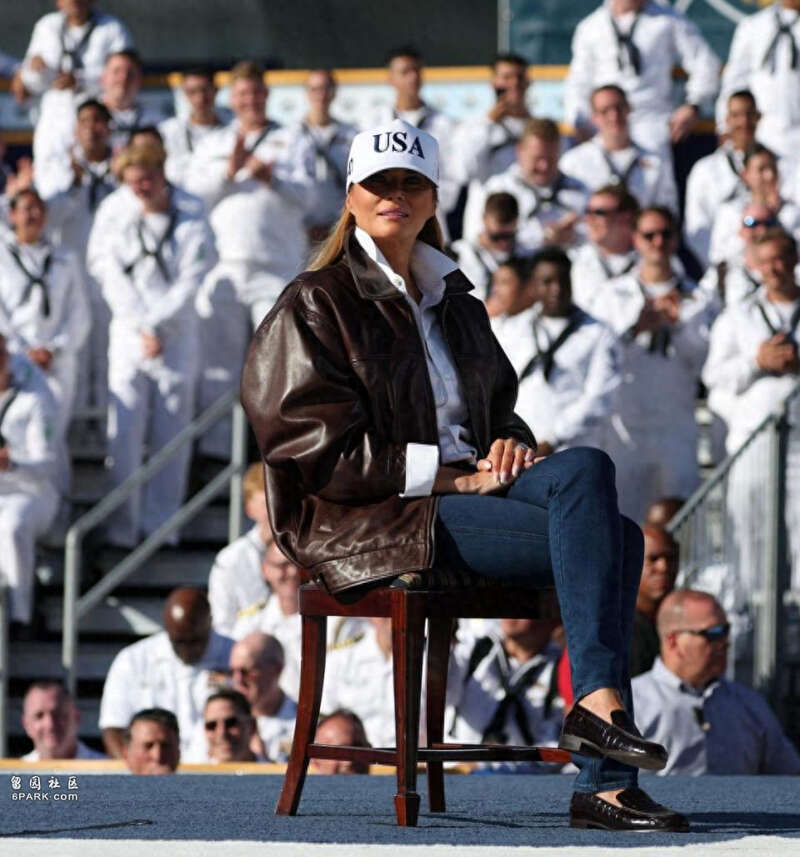 这场活动是在驻扎在弗吉尼亚州诺福克的哈里·S·杜鲁门号航空母舰的甲板上举行的。梅拉尼娅穿着一件咖啡色的皮夹克亮相,很容易让人联想到好莱坞经典影片《壮志凌云》(Top Gun)中的女主角造型。而正是这种“戏剧化”的出场,也点燃了舆论的讨论,支持与批评的声音交织在一起。