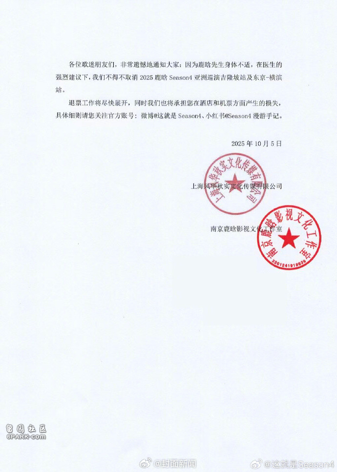 10月6日,2025鹿晗Season4亚洲巡演官博@这就是Season4 发布演出取消公告,其中提到,“因为鹿晗先生身体不适,在医生的强烈建议下,我们不得不取消2025鹿晗 Season4亚洲巡演吉隆坡站及东京-横滨站。”