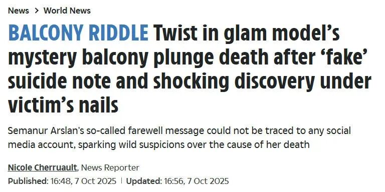 去年10月20日,她从土耳其昌卡亚区一栋43层的公寓楼上坠楼身亡,年仅27岁。