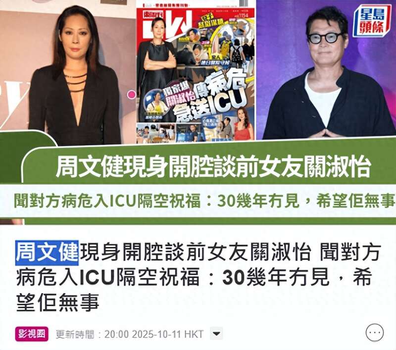 59岁香港歌手关淑怡上周在家中摔倒昏迷,送ICU抢救至今没有传来好消息,前男友周文健在10月11日出席活动接受采访,坦言两人分手三四十年没联系,还是朋友告知关淑怡昏迷的消息,他很好奇也很担心。