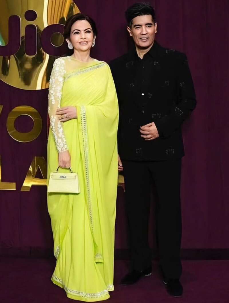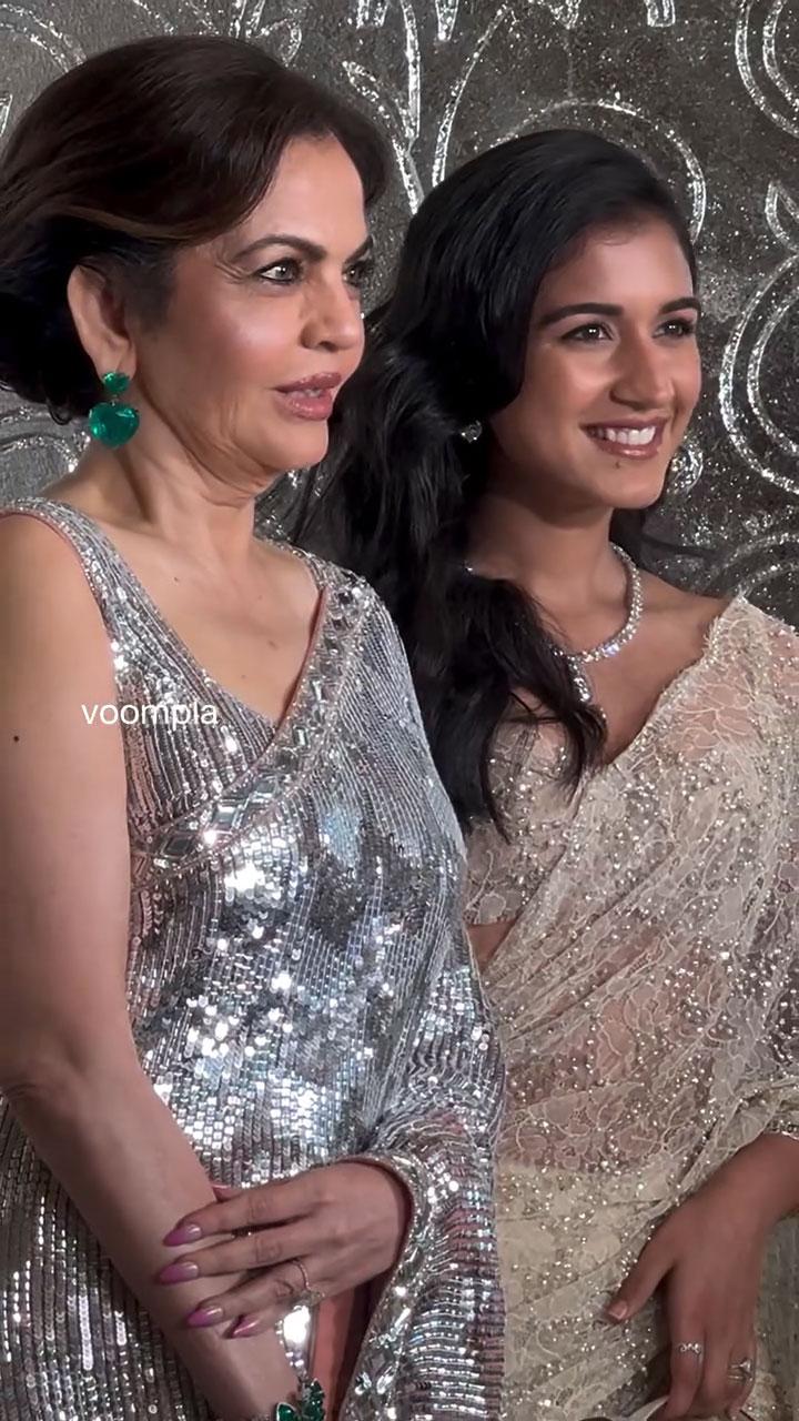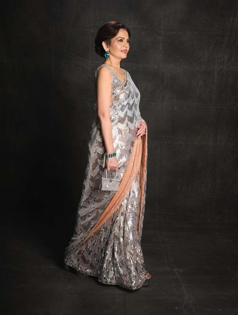 身为安巴尼家女主人的妮塔·安巴尼,也是经常穿着马洛特拉的作品亮相,这一次也不例外。银色亮片制成的纱丽在灯光的照耀下很是耀眼,为此妮塔还特意搭配了一只迷你版的爱马仕铂金包,据称那只包属于高级珠宝系列中的一款,颇为珍稀。