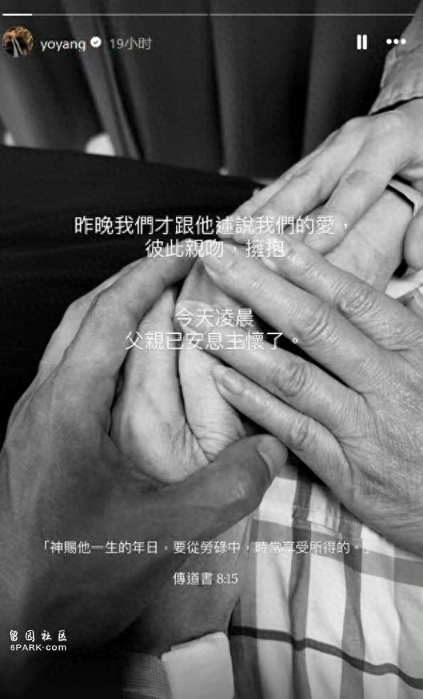 杨祐宁可能知道父亲时日不多,表示在10月11日晚上,向父亲述说了爱意并且拥抱亲吻,12日凌晨父亲离开了大家,在家人的陪伴下。杨祐宁晒出紧握父亲手的黑白照片,表示父亲已安息主怀。