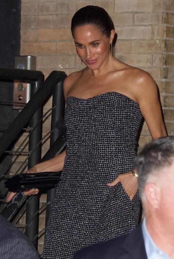 44岁的梅根一身黑灰色抹胸裙亮相,搭配黑色高跟鞋和手拿包,气场十足。41岁的哈里则身着蓝色西装搭配白色系扣衬衫,贴心地跟在妻子身后,为她保驾护航。