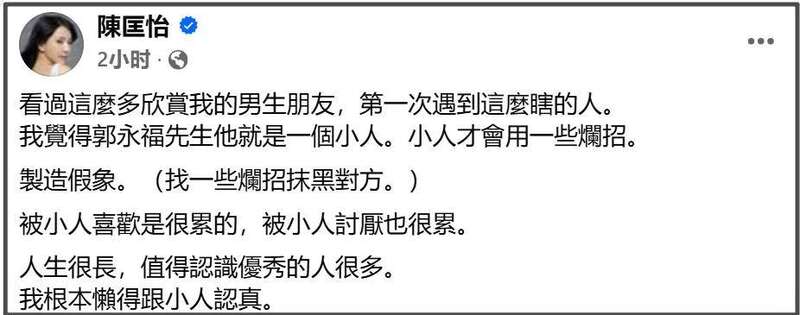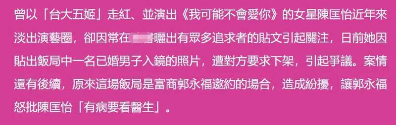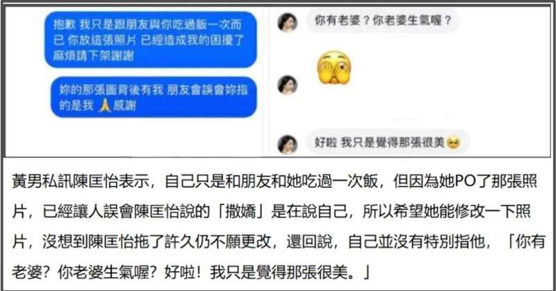 如今陈匡怡再次卷入行为失控争议,源头就在于她发布于个人社媒的一张自拍照,照片中有位黄姓已婚男出镜,是陈匡怡台大学长,因为陈匡怡用词暧昧,还动不动就在社媒晒追求者,黄学长担心引起误会,就联系陈匡怡希望她删除照片。