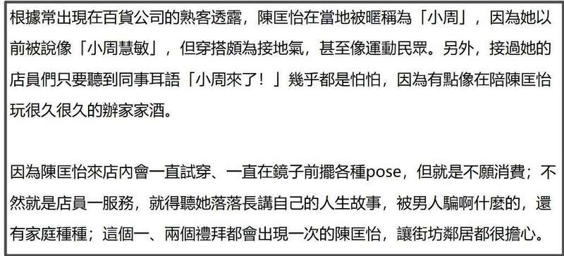 顺道一提,台媒还爆料陈匡怡时常去百货公司找店员诉苦,讲自己被男人骗和家庭种种,听得人格外唏嘘。
