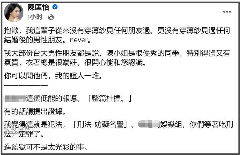 当然了,无论如何陈匡怡都不该被造谣,同时希望她能通过整件事,审视一下自身困境,37岁了,说大不大、说小不小的年纪,不要再沉沦下去了。