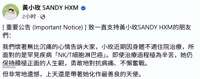 黄小玫团队在15日下午发布讣告,称黄小玫近期因身体不适入院治疗,其患上的是罕见病“NK/T细胞淋巴癌”,即使治疗过程极为辛苦,但黄小玫保持积极正面的人生观,勇敢对抗病痛,不懈奋斗,非常的遗憾,上天还是带着她化作最善良的天使。