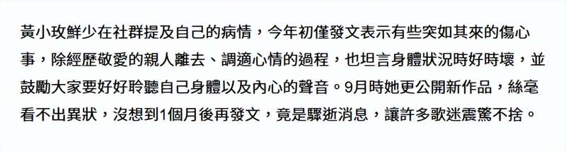 据台媒10月15日报道,台湾省歌手黄小玫因罕见病去世,年仅34岁。