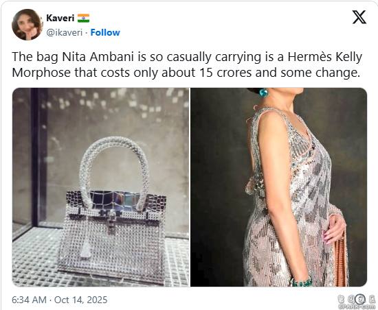 身家高达1027亿美元(约新台币3.2兆元)的印度首富安巴尼(Mukesh Ambani)去年替么儿娶媳妇连办3天婚前豪华派对,邀请美国歌坛天后蕾哈娜出场表演。安巴尼夫人妮塔期间大秀据估价近19亿元台币的高档珠宝,令人咋舌。最近妮塔再度跃上媒体,她在一场派对上亮出镶嵌3025颗钻石、全球最贵的爱马仕包,再度惊艳全场。