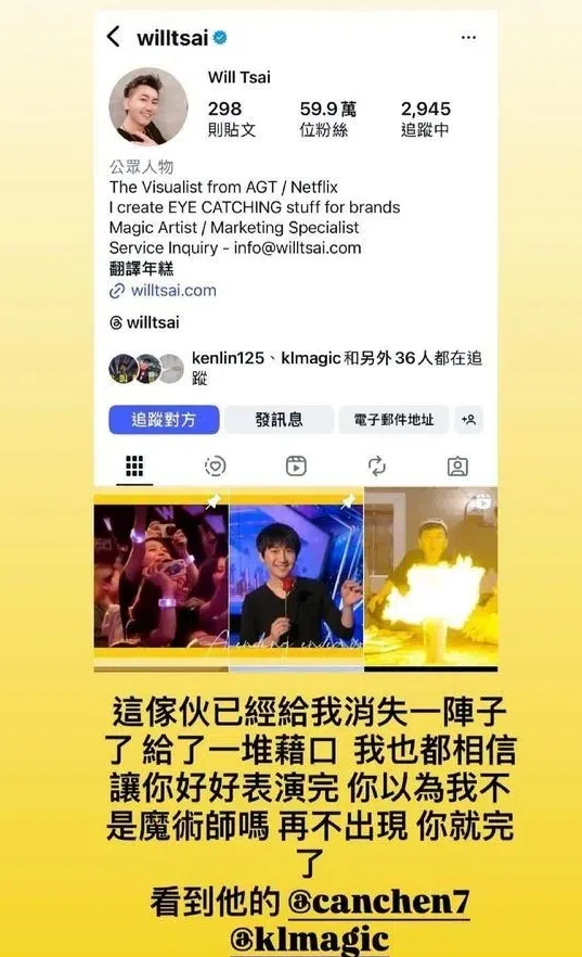 周杰伦(周董)15日在个人拥有上千万粉丝的IG上突发“寻人启事”,点名魔术师好友蔡威泽,语气罕见激烈:“再不出现,你就完了。”一时间引发全网震动。