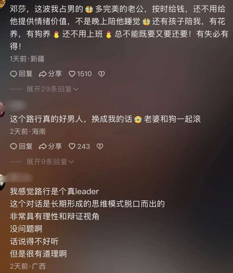 还有,从他们一个星期都不谈一次话,以及路行生意受挫没人安慰来看,邓莎连情绪价值都没有给对方提供,反而还养了6条狗打扰对方的休息。
