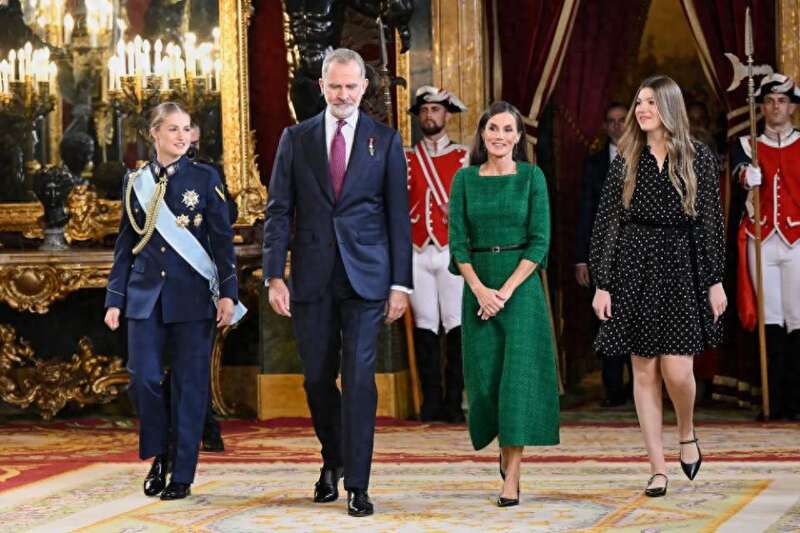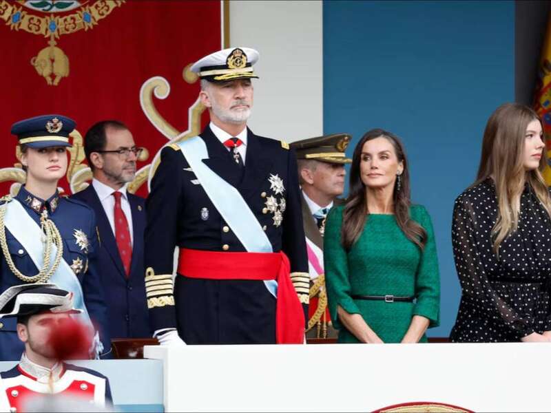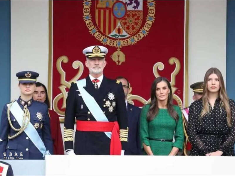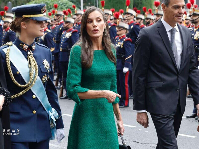 在阅兵仪式上,费利佩国王身着海军白色礼服,肩章上的金穗与绶带彰显着王室与军队的深厚联系。而莱蒂齐亚王后则选择了一袭森林绿的高定礼服,剪裁简约却暗藏东方刺绣纹样,优雅中透着现代感。