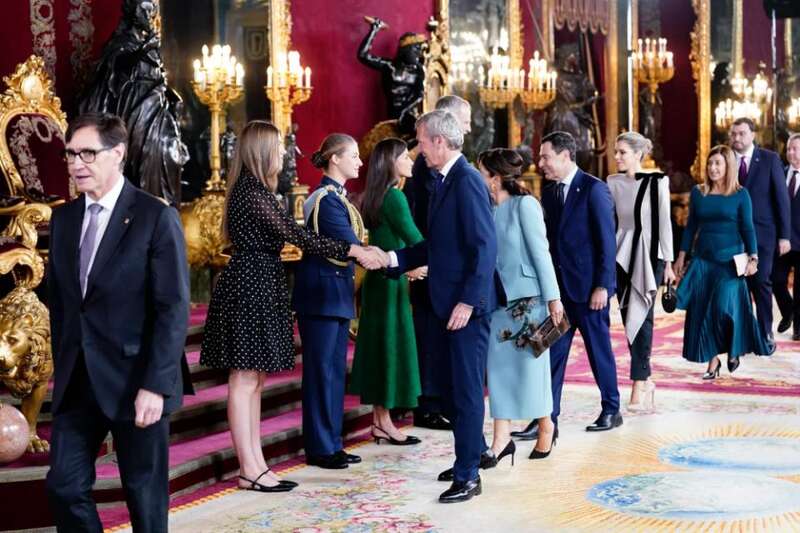 在招待会现场,莱昂诺尔公主颈间佩戴的金羊毛骑士团徽章闪闪发亮,与父亲费利佩六世国王佩戴的同款勋章形成呼应,暗示着王位继承的隐性仪式。