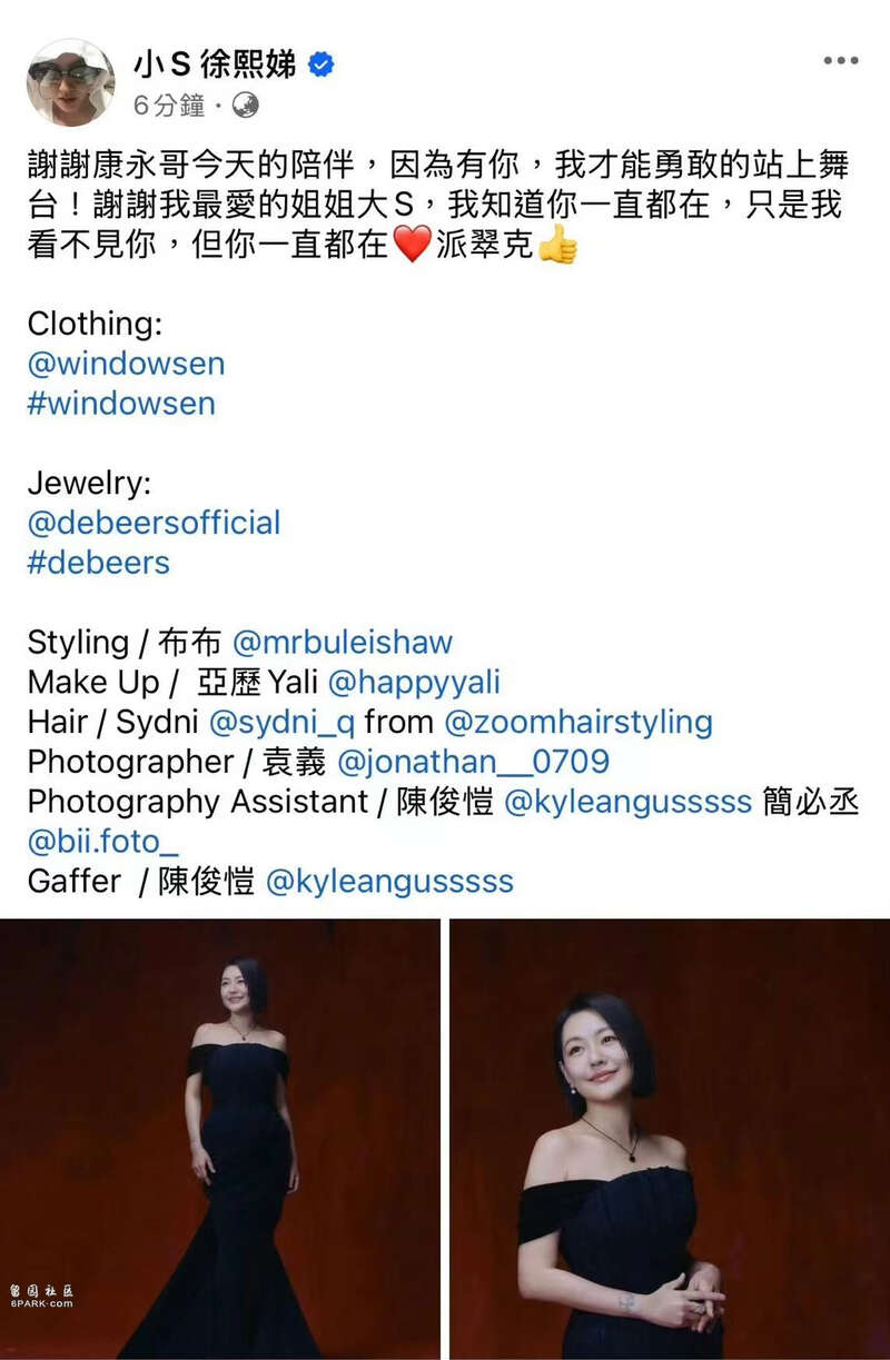 领奖后小S发文感谢蔡康永,感谢他的陪伴,因为有他,才能勇敢的站上舞台,还感谢她姐姐大S,也感谢搭档派翠克。