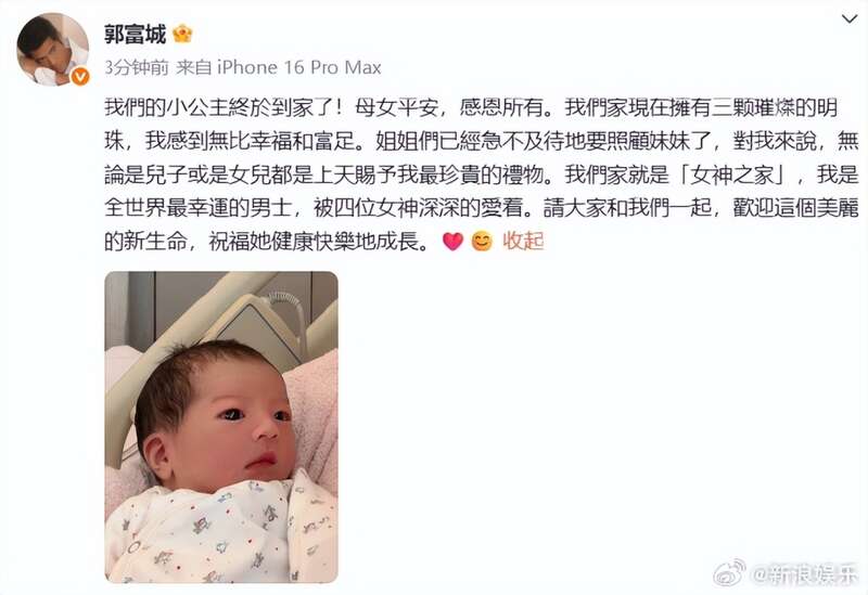10月22日,香港天王郭富城在微博投下一枚“幸福炸弹”,正式宣布三胎女儿出生,一句“我们的小公主终于到家了!”瞬间引爆全网。他不仅大方晒出宝宝正脸照,更将自家定义为“女神之家”,自称是“被四位女神爱着”的“全世界最幸运的男士”,幸福溢于言表。