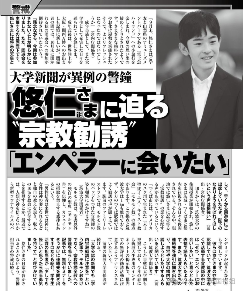 一些传教士言之凿凿地表示,他们很荣幸能和悠仁的距离那么近,已经迫不及待想要和他见面畅聊。为了和悠仁搭上话,教会还派出在筑波大学就读的女教徒,在校园里“蹲点”,希望拉他一起参加活动。