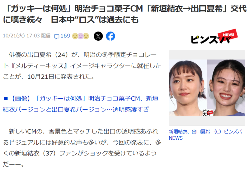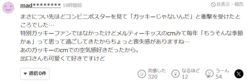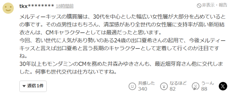 对此,日本网友纷纷表示,出口夏希没有不好,她也很好很可爱,但她不是新垣结衣啊,我们还是想要gakki啊。“就在刚才看到便利店的海报‘不是gakki’受到了冲击…虽然不是特别的gakki粉丝,但是每年看到meltykiss的cm都会觉得“已经是这样的季节了啊”,所以有点失落感…因为喜欢那个gakki的cm中的空气感。出口同学也很可爱,我也很喜欢。”