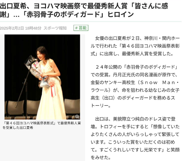 2024年,出口夏希与日本顶流男团Snowman成员拉乌卢搭档主演了动作喜剧片《赤羽骨子的亲卫队》,在片中饰演因某件事而遭到生命威胁的女主角赤羽骨子。出口夏希凭借此片,拿到了演艺生涯的第一个奖项——第46届横滨电影节最佳新人奖。