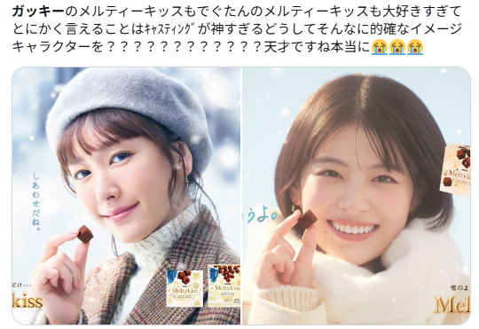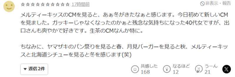 “看到meltykiss的广告,感觉冬天来了。今天第一次看到了新的广告。40多岁的女性觉得自己不是gakki了,但出口小姐也很清爽,我很喜欢她。特别是生茶的广告。顺便说一下,看到山崎的面包节就会感受到春天,看到月见汉堡就会感受到秋天,看到meltykiss和北海道炖菜就会感受到冬天(笑)”