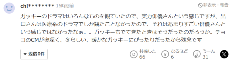 “我看过很多gakki演的电视剧,感觉她是位实力派演员。不过我只看过出口夏希演的医疗剧,所以并不觉得他是特别厉害的演员。。gakki刚出道的时候是不是也是这样呢?她拍的巧克力广告很有深度,充满冬日氛围,和温暖的她非常契合,真是太可惜了”