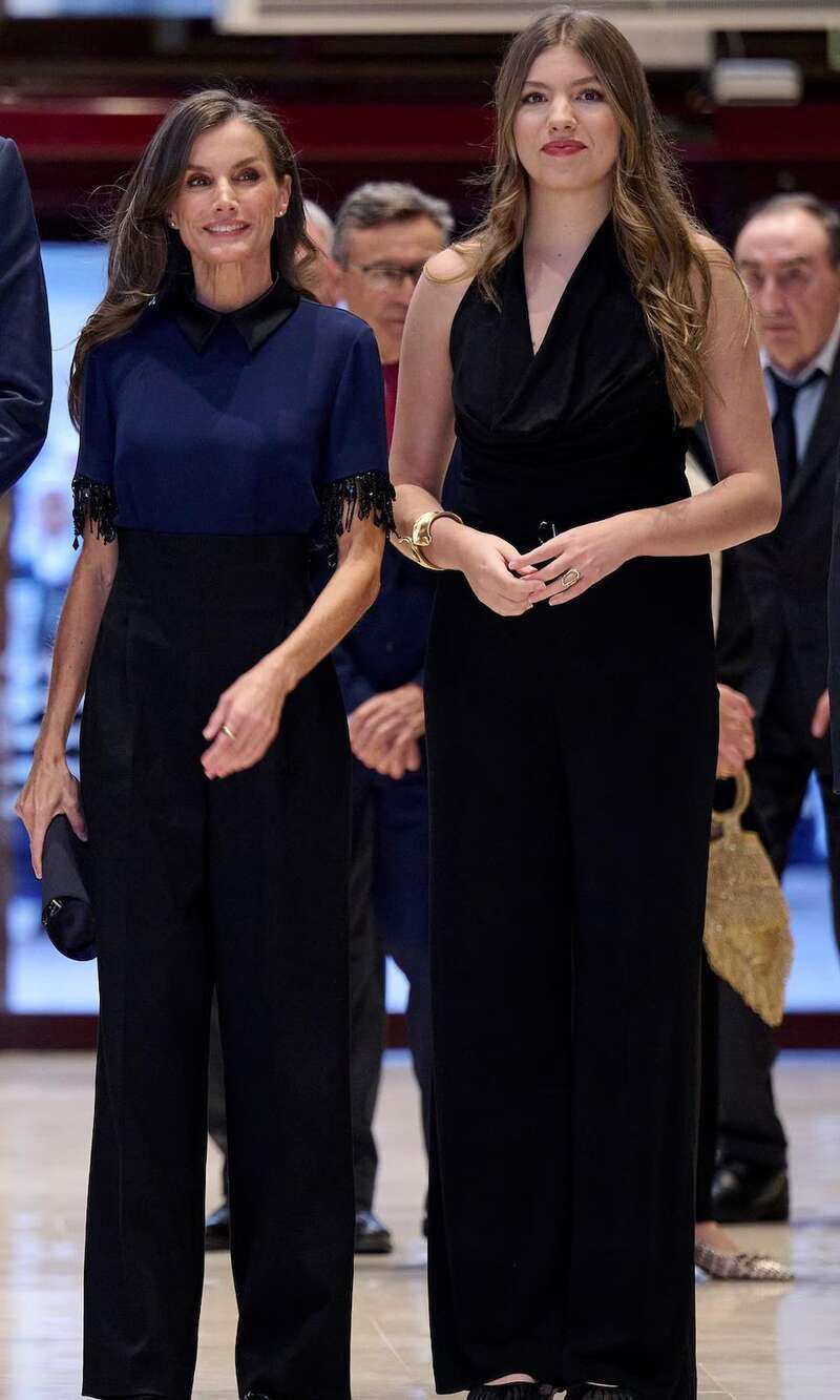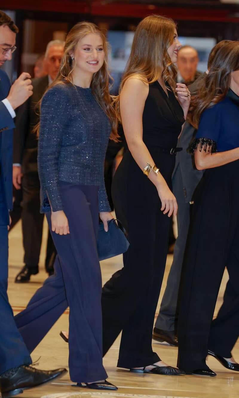 当天莱昂诺尔和她的父母选择了深蓝色调,显得颇为深沉,却也能比纯黑色要活泼一些。不仅如此,无论是王后还是公主,都穿了长裤,似乎想要营造出专业且自信的感觉。