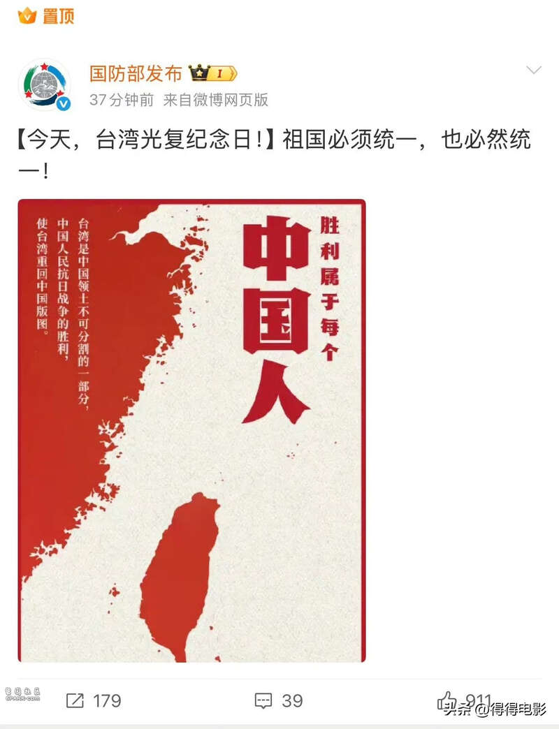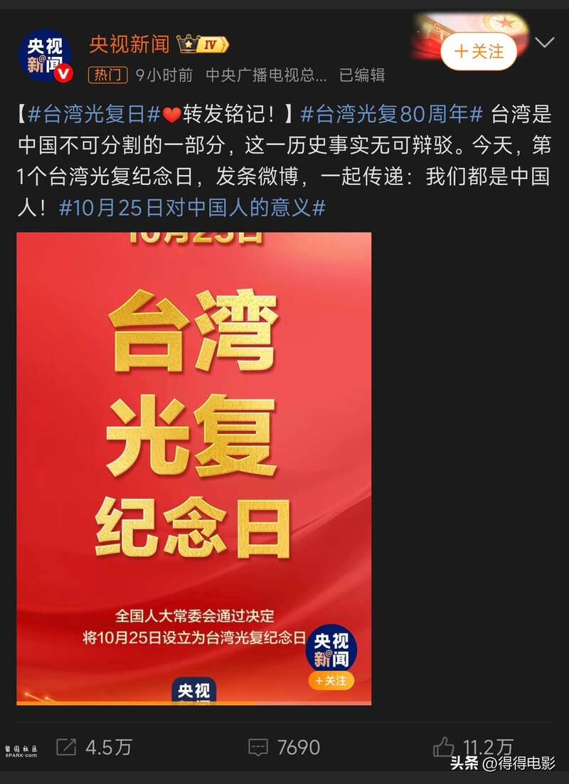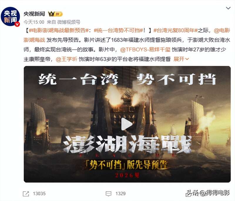 而央视官方账号先后两次发文,把台湾光复纪念日和《澎湖海战》电影连接在一起,也是对外释出的的某种信号。