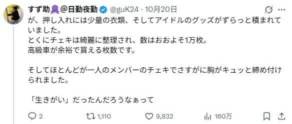 “而打开壁橱一看,会发现里面只放着少量的衣物,以及整整齐齐堆满了偶像的周边物品。
