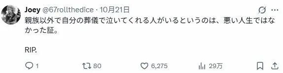 “除了你的家人之外,还有人在你的葬礼上哭泣,这证明你的一生还不算太糟。安息吧。”