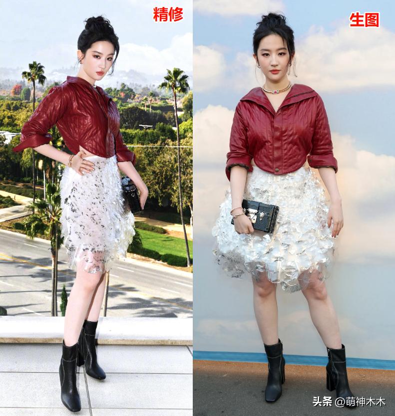 刘亦菲在内娱红毯照上的大直角肩,到了外媒镜头下也变成了溜肩,皮衣的肩线还被领子挡住,导致刘亦菲的生图看上去很壮实,还有点头大身小。
