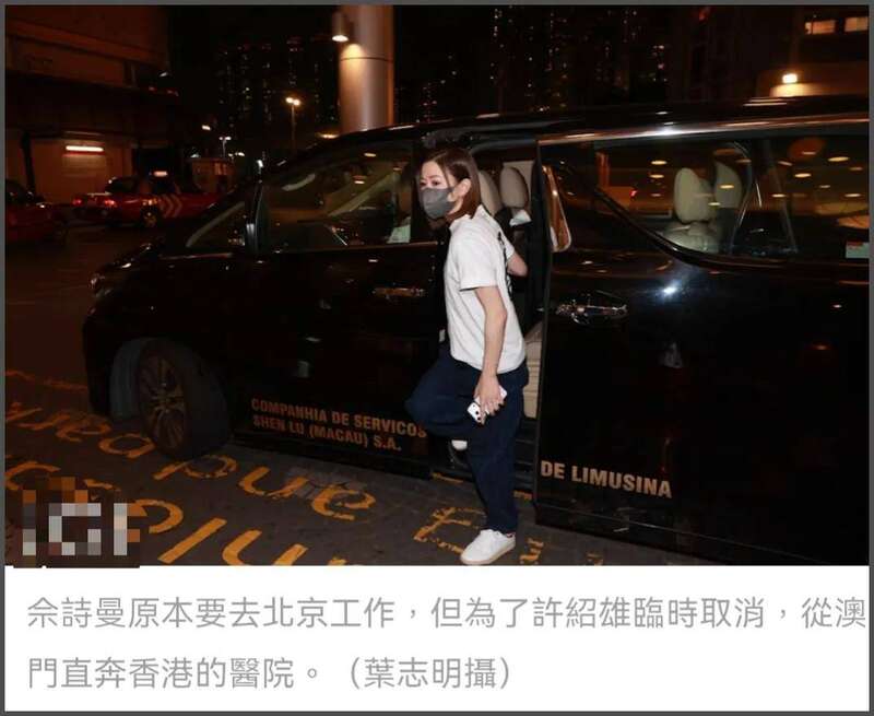 在采访时佘诗曼提到许绍雄病危一事,绷不住情绪,眼泪差点夺眶而出。晚间佘诗曼取消工作行程,匆忙坐车赶到医院。