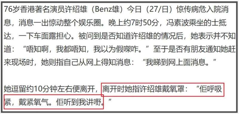 冯素波也没有看望很久,大概十分钟左右就出来了,向媒体透露许绍雄呼吸很喘,戴着氧气罩,能听到她说话。