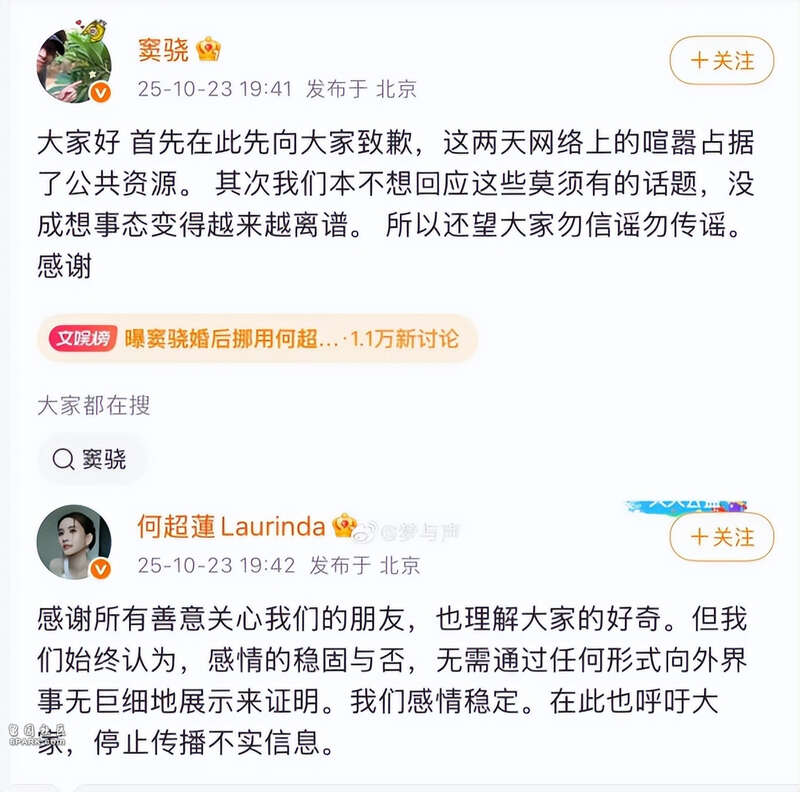 窦骁何超莲已经发公开声明了,说所有的微博传闻,闹了几天沸沸扬扬的热搜,都是无稽之谈。