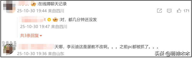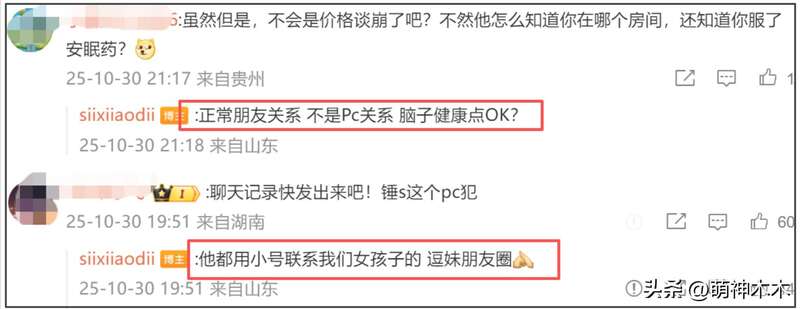 同时有网友质疑她目的不纯,认为是价格谈崩了,不然怎么能知道她房间,司晓迪直接回复否认,表示是正常朋友关系,不是嫖娼关系,让网友脑子健康点。还爆料李云迪习惯用小号联系女孩子。