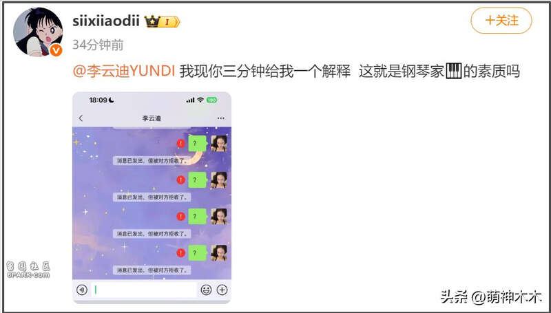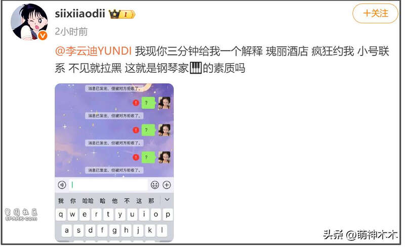 司晓迪还晒出了截图,证明自己被李云迪拉黑了,自己连续发了多个问号,对方都没有加回来。