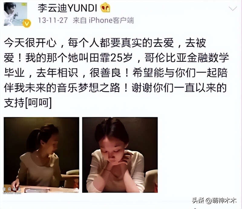 李云迪公开过的女友只有一位,2013年在王力宏官宣结婚之后,李云迪也官宣了女友田霏,对方她毕业于哥伦比亚大学附属巴纳德学院金融数学专业,曾就职于中信证券。据悉,2012年两人在公司年会上相识后多次同游,恋情持续至2016年9月正式分手。在此之前,李云迪一直有一位网传的前任华真,但他并没有公开回应过。