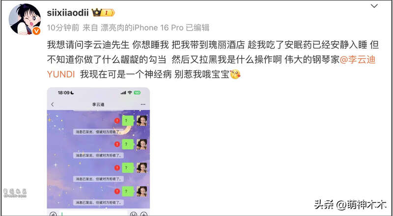 从女方爆料的信息看,李云迪似乎对她并没有上心,只是疯狂想约她,约不到就拉黑了。女方发现后就恼羞成怒开始发文喊话。其实男的目的不纯的话,没必要因为拉黑而生气,远离这种人才是最好的, 也是不懂司晓迪为啥那么暴怒。