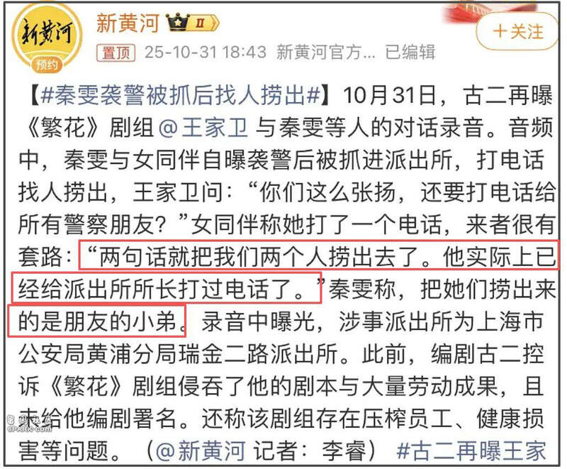 《繁花》幕后编剧古二晒出会议记录,无意间爆料秦雯和助理许思窈的袭警事件,两人还向王家卫炫耀有人脉捞人,风波发酵之后此事迅速冲上热搜,引起网友愤怒,呼吁严查!