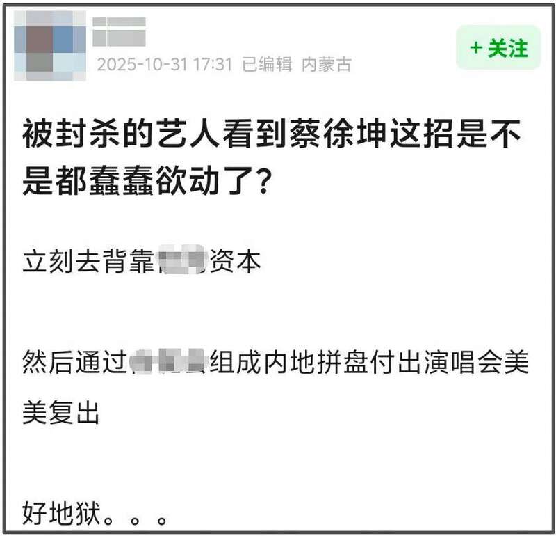 不过随着舆论升级,知名狗仔葛斯齐出现了,还记得蔡徐坤卷入私生活争议的时候,他就表示自己手头有料,如今又一次把矛头对准蔡徐坤,上来就是一句“对于该艺人及团队出尔反尔许多过往内幕已无需再谈,失德艺人必须凉”。